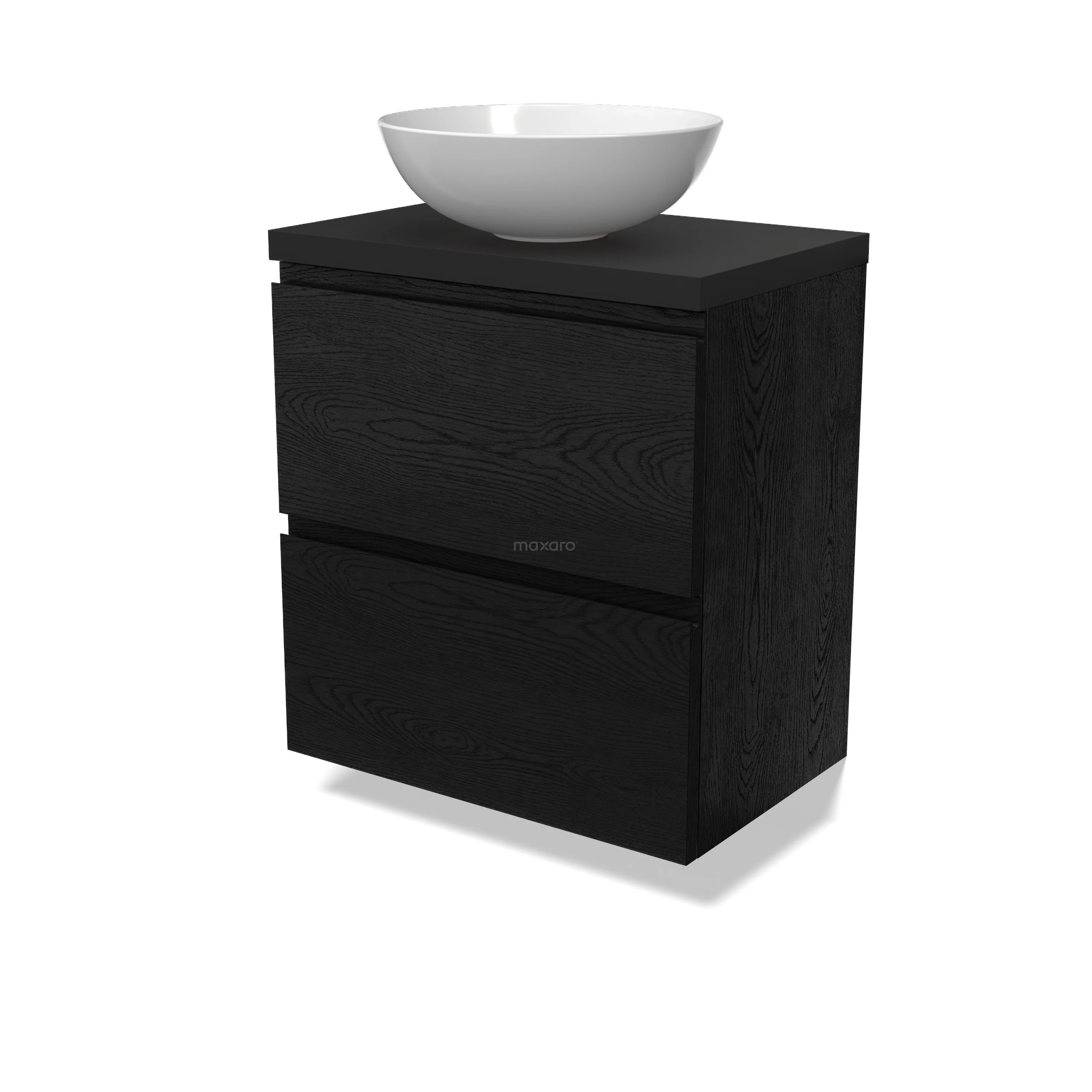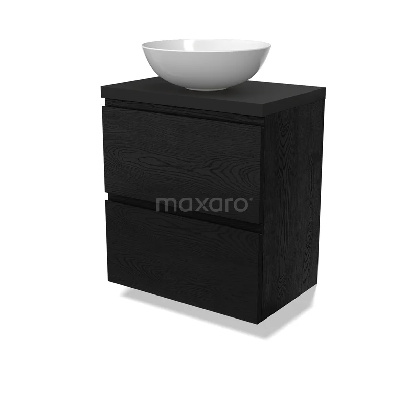 Modulo Plato Slim Badmöbel mit Aufsatzwaschbecken | 60 cm Schwarze Eiche Grifflos front Matt Schwarz blatt 2 übereinanderliegende Schubladen