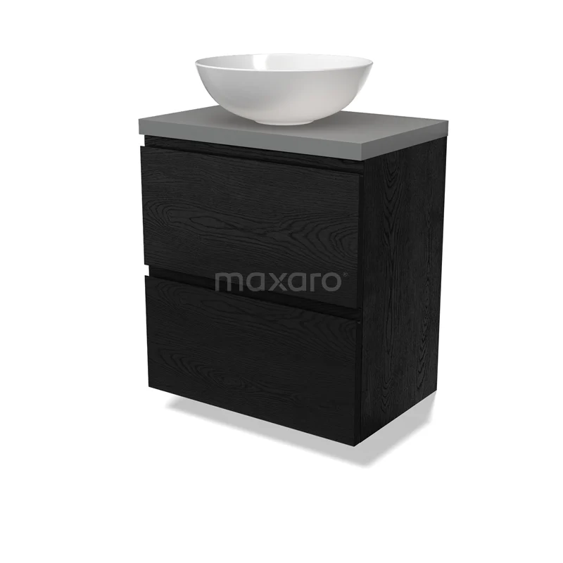 Modulo Plato Slim Badmöbel mit Aufsatzwaschbecken | 60 cm Schwarze Eiche Grifflos front Mittelgrau blatt 2 übereinanderliegende Schubladen