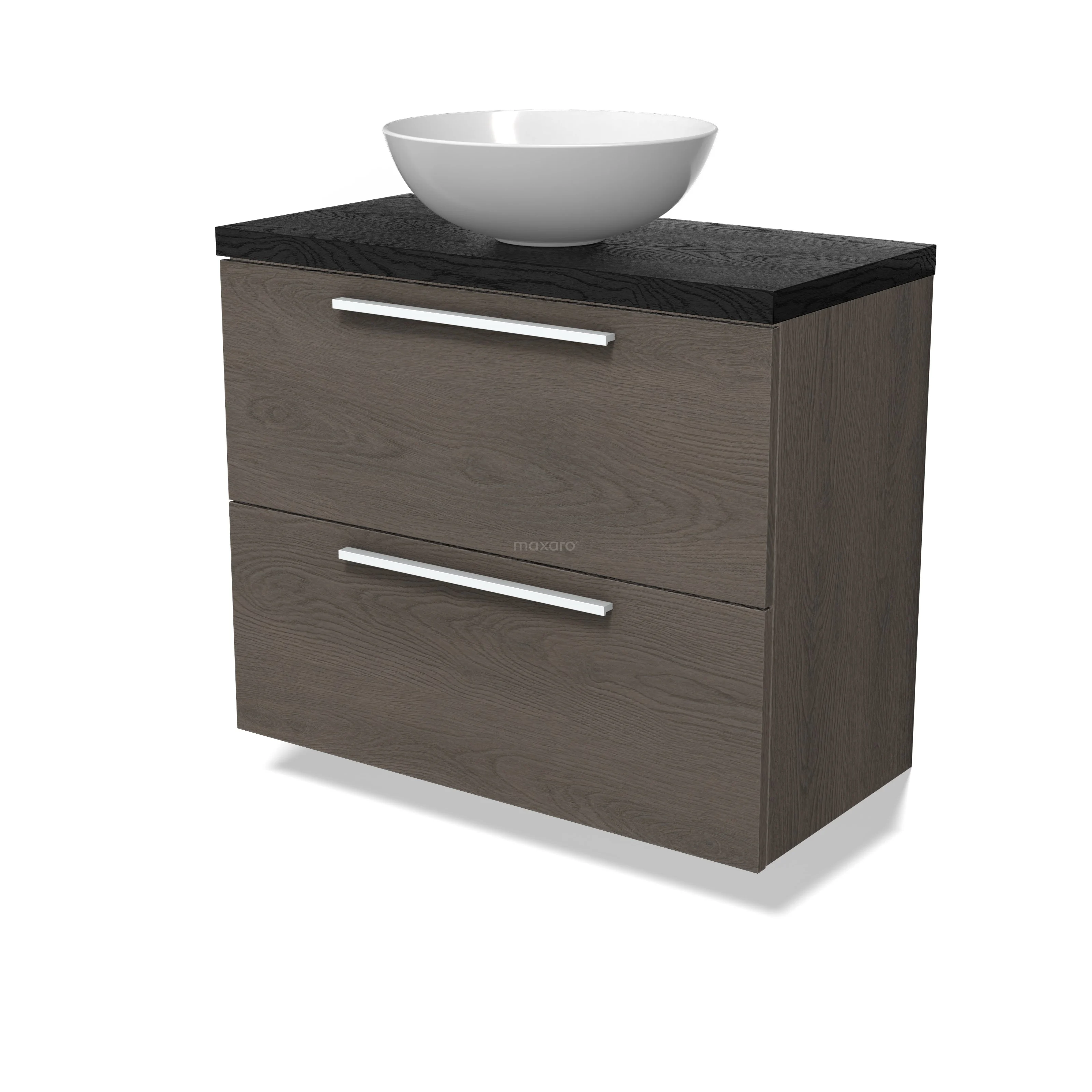 Modulo Plato Slim Badmöbel mit Aufsatzwaschbecken | 80 cm Dunkelbraune Eiche Flach front Schwarze Eiche blatt 2 übereinanderliegende Schubladen