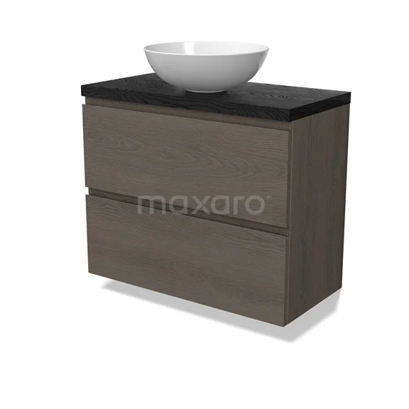 Modulo Plato Slim Badmöbel mit Aufsatzwaschbecken | 80 cm Dunkelbraune Eiche Grifflos front Schwarze Eiche blatt 2 übereinanderliegende Schubladen