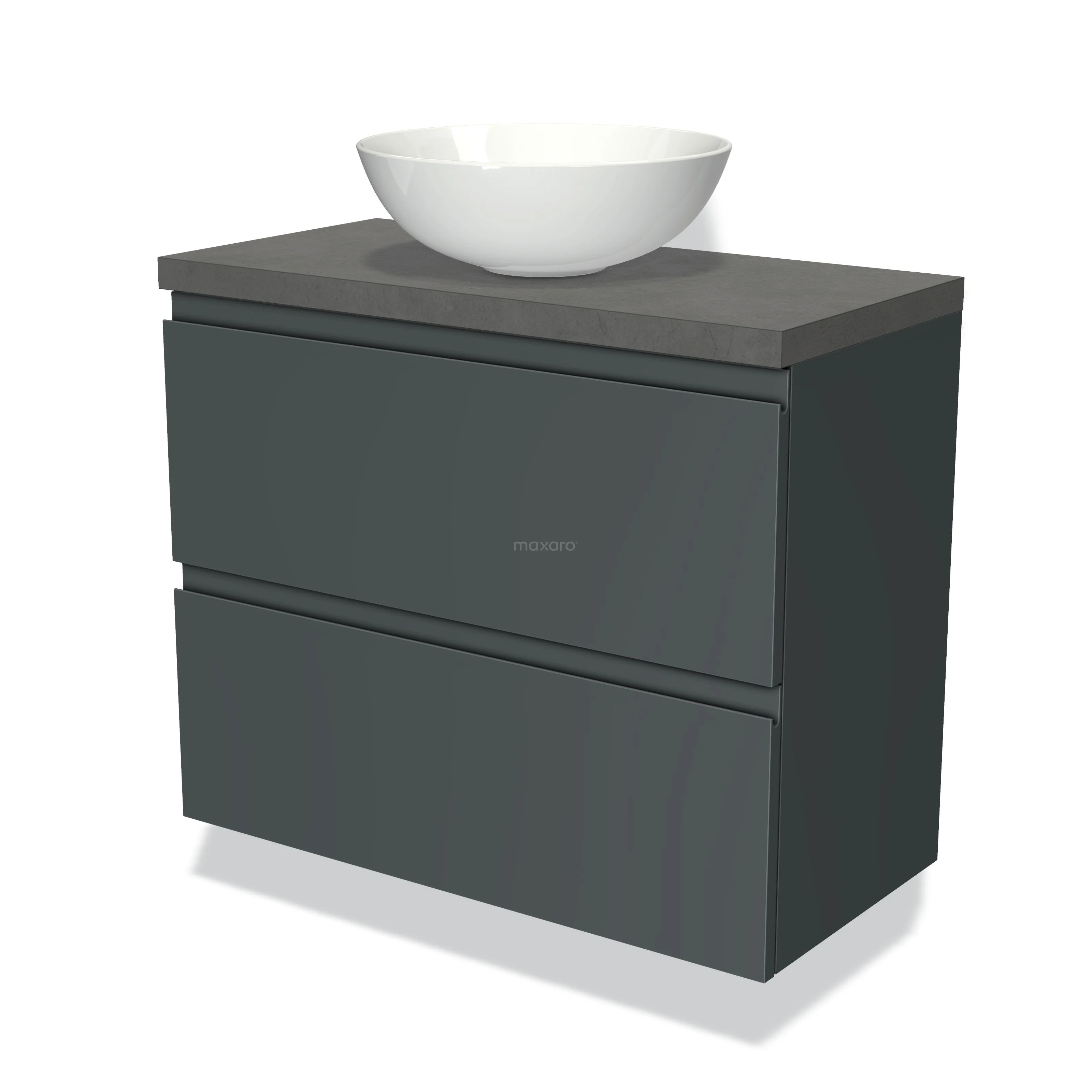 Modulo Plato Slim Badmöbel mit Aufsatzwaschbecken | 80 cm Dunkelgrau Grifflos front Dunkelgrauer Beton blatt 2 übereinanderliegende Schubladen