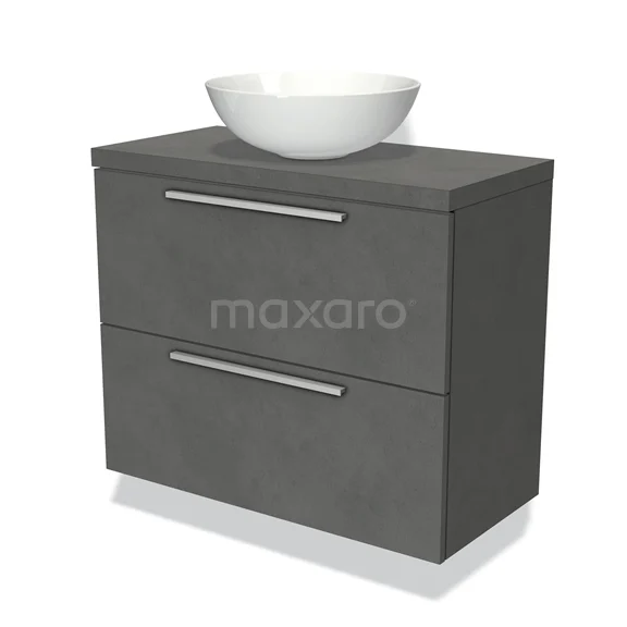 Modulo Plato Slim Badmöbel mit Aufsatzwaschbecken | 80 cm Dunkelgrauer Beton Flach front Dunkelgrauer Beton blatt 2 übereinanderliegende Schubladen