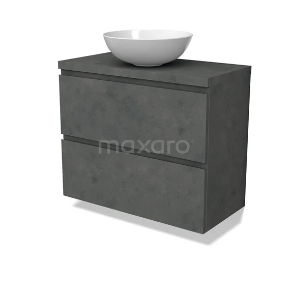 Modulo Plato Slim Badmöbel mit Aufsatzwaschbecken | 80 cm Dunkelgrauer Beton Grifflos front Dunkelgrauer Beton blatt 2 übereinanderliegende Schubladen