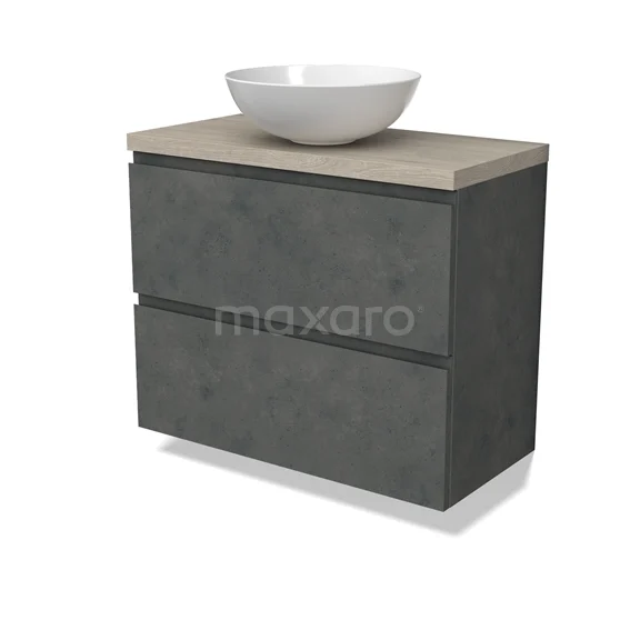 Modulo Plato Slim Badmöbel mit Aufsatzwaschbecken | 80 cm Dunkelgrauer Beton Grifflos front Hellgraue Eiche blatt 2 übereinanderliegende Schubladen