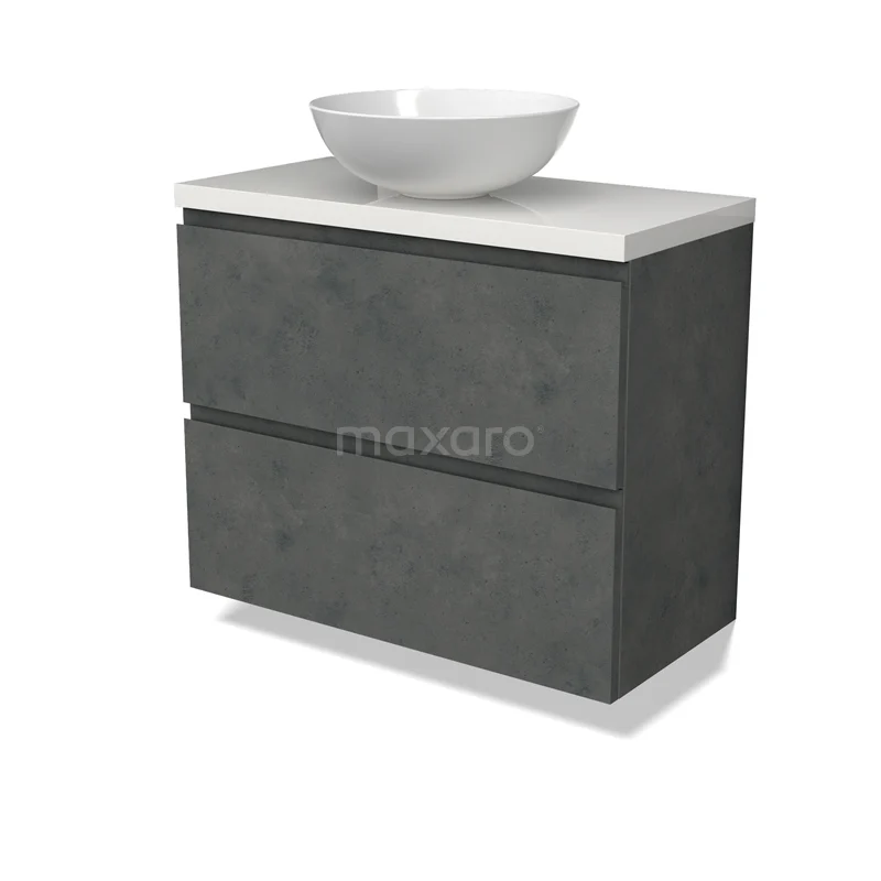 Modulo Plato Slim Badmöbel mit Aufsatzwaschbecken | 80 cm Dunkelgrauer Beton Grifflos front Hochglanz Weiß blatt 2 übereinanderliegende Schubladen