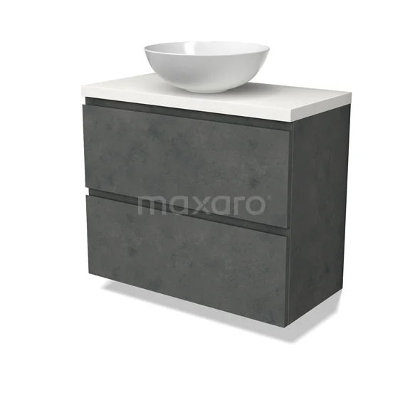 Modulo Plato Slim Badmöbel mit Aufsatzwaschbecken | 80 cm Dunkelgrauer Beton Grifflos front Matt Weiß blatt 2 übereinanderliegende Schubladen