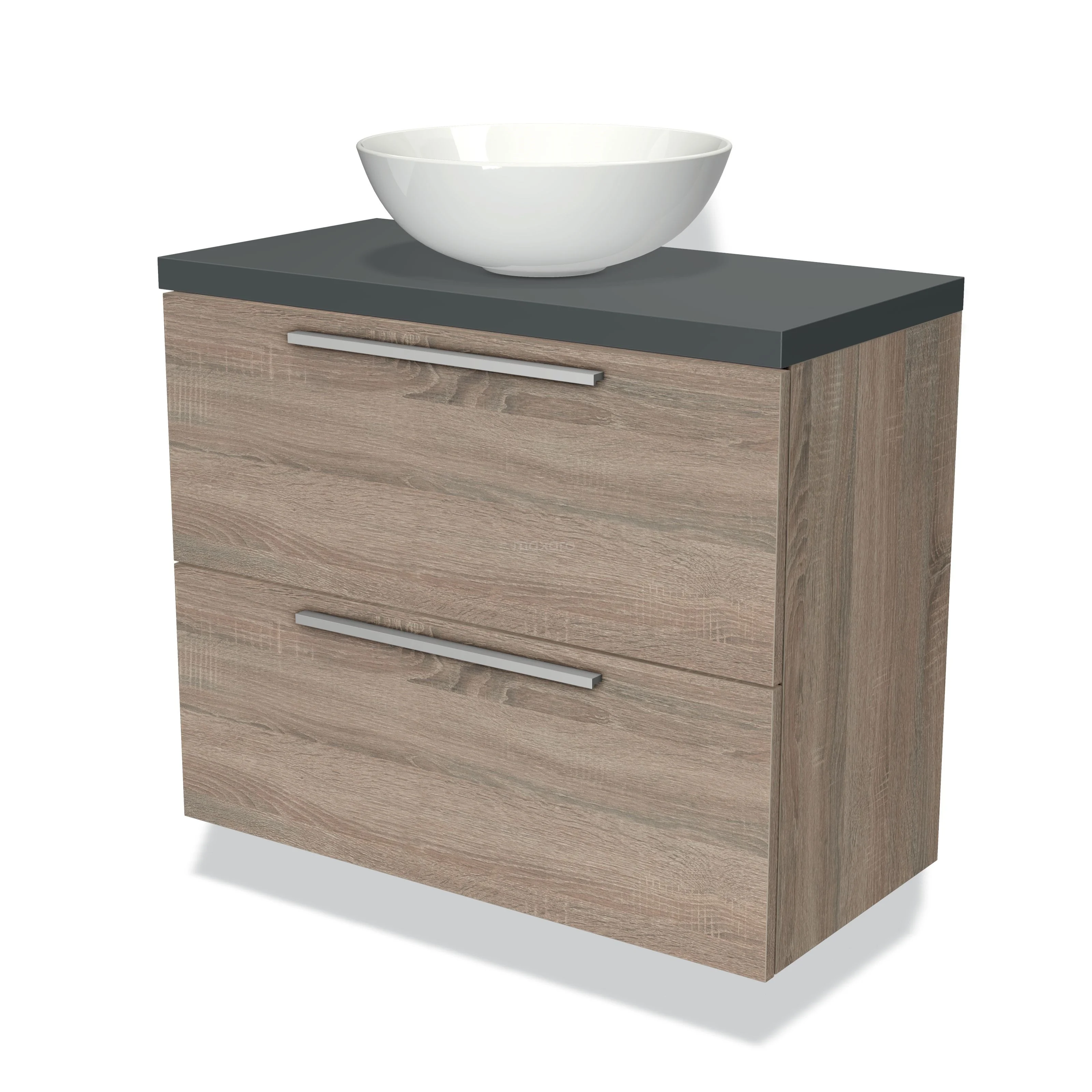 Modulo Plato Slim Badmöbel mit Aufsatzwaschbecken | 80 cm Eiche Flach front Dunkelgrau blatt 2 übereinanderliegende Schubladen