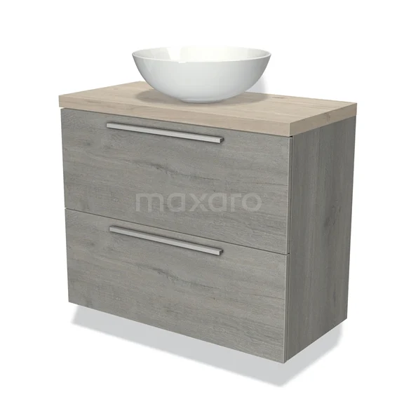 Modulo Plato Slim Badmöbel mit Aufsatzwaschbecken | 80 cm Graue Eiche Flach front Hellgraue Eiche blatt 2 übereinanderliegende Schubladen