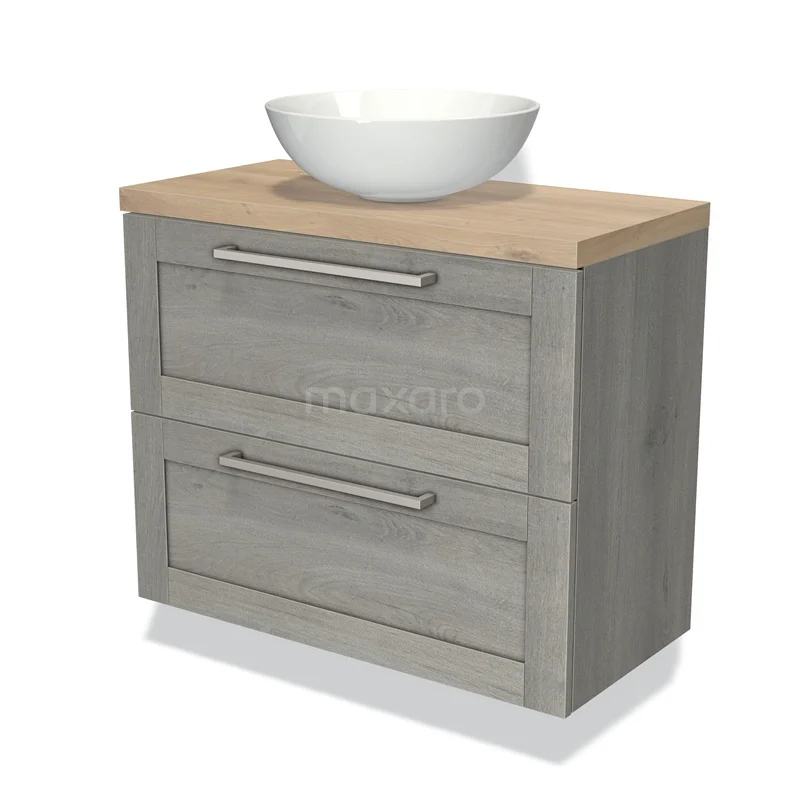 Modulo Plato Slim Badmöbel mit Aufsatzwaschbecken | 80 cm Graue Eiche Rahmen front Hellbraune Eiche blatt 2 übereinanderliegende Schubladen