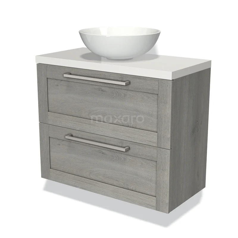 Modulo Plato Slim Badmöbel mit Aufsatzwaschbecken | 80 cm Graue Eiche Rahmen front Hochglanz Weiß blatt 2 übereinanderliegende Schubladen