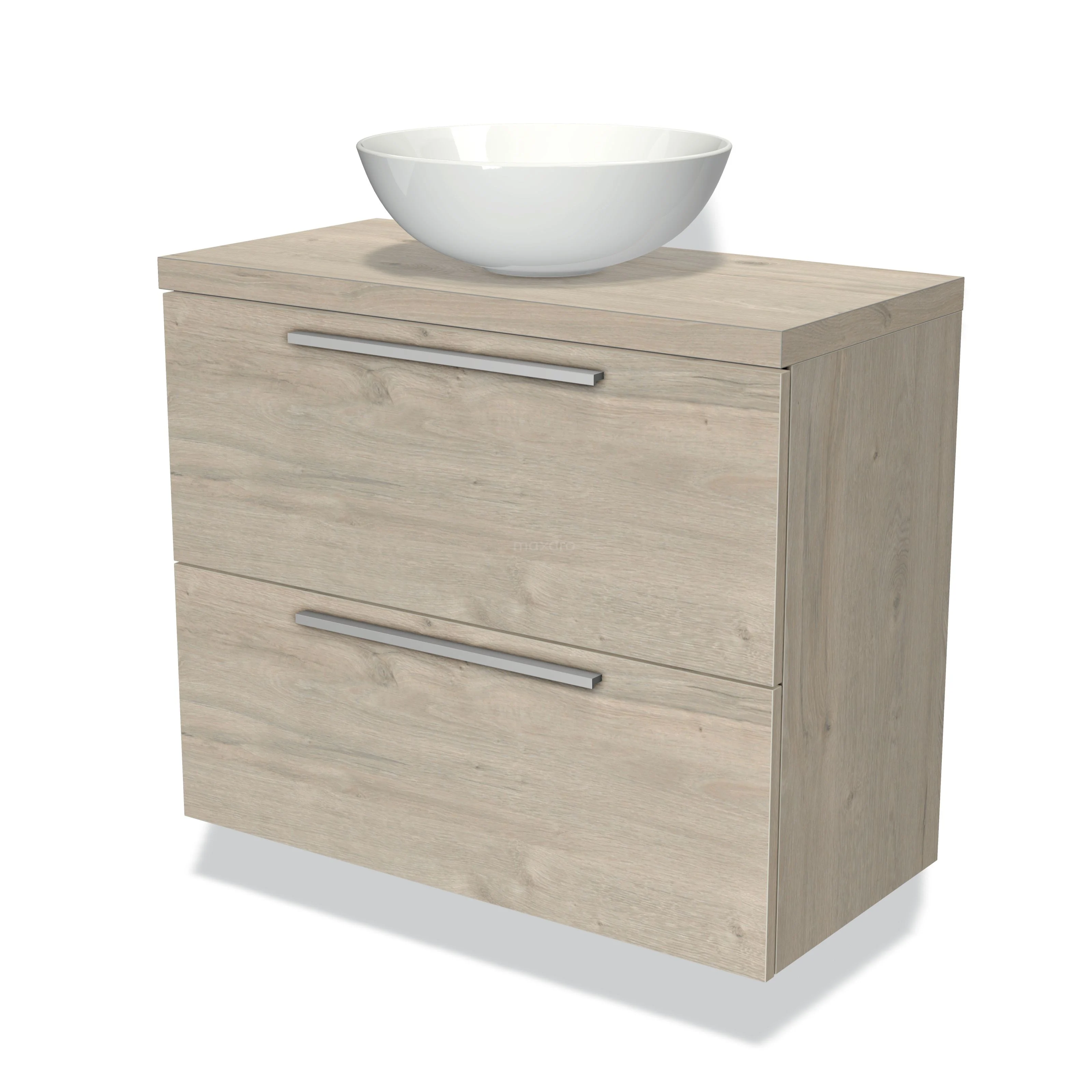 Modulo Plato Slim Badmöbel mit Aufsatzwaschbecken | 80 cm Hellgraue Eiche Flach front Hellgraue Eiche blatt 2 übereinanderliegende Schubladen