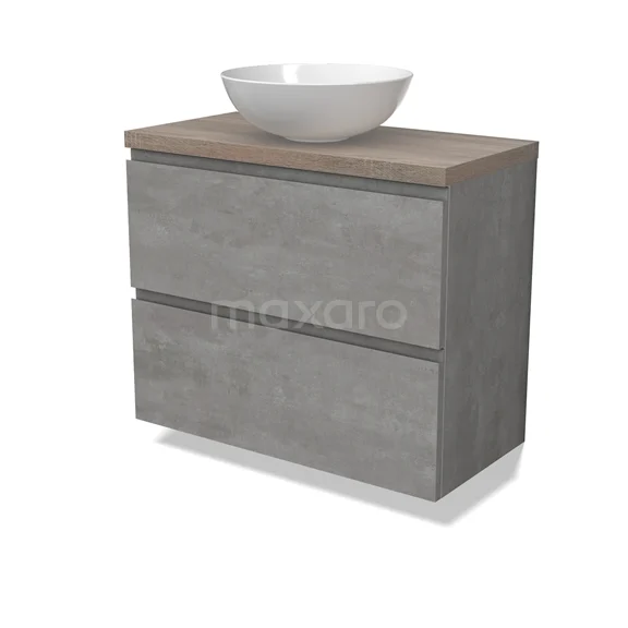 Modulo Plato Slim Badmöbel mit Aufsatzwaschbecken | 80 cm Hellgrauer Beton Grifflos front Eiche blatt 2 übereinanderliegende Schubladen