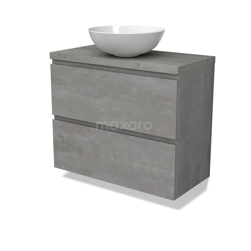 Modulo Plato Slim Badmöbel mit Aufsatzwaschbecken | 80 cm Hellgrauer Beton Grifflos front Graue Eiche blatt 2 übereinanderliegende Schubladen