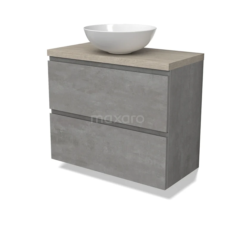 Modulo Plato Slim Badmöbel mit Aufsatzwaschbecken | 80 cm Hellgrauer Beton Grifflos front Hellgraue Eiche blatt 2 übereinanderliegende Schubladen