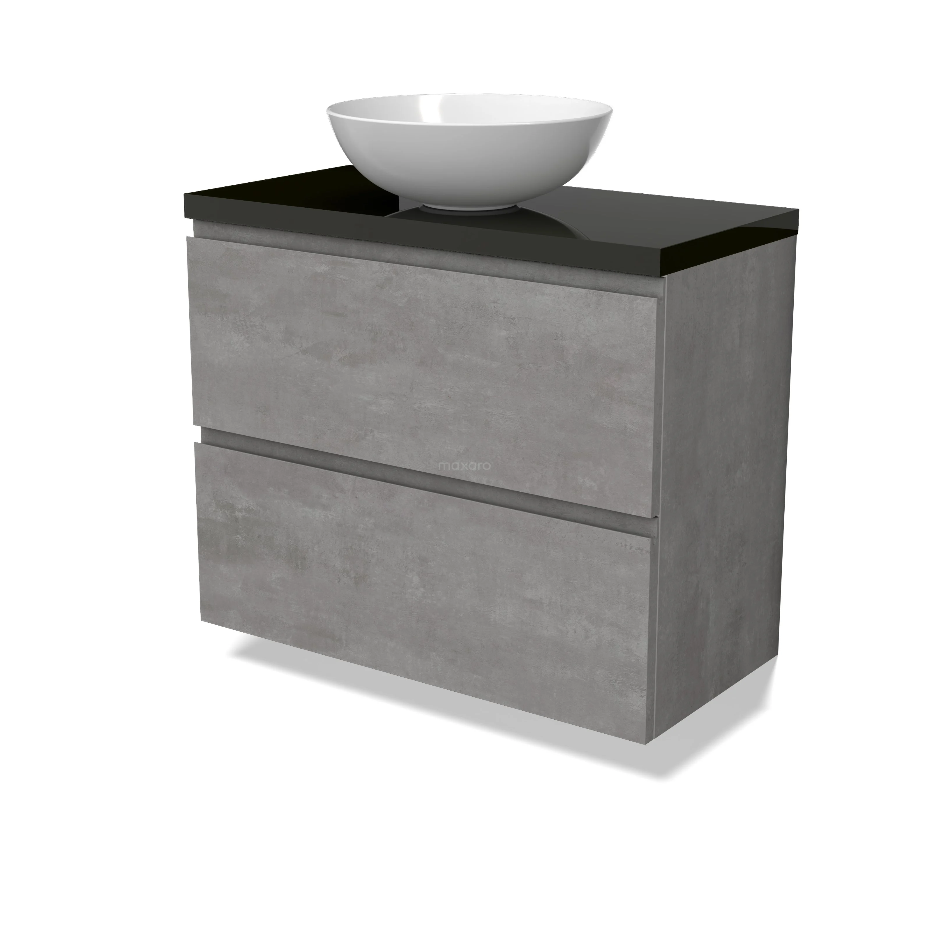Modulo Plato Slim Badmöbel mit Aufsatzwaschbecken | 80 cm Hellgrauer Beton Grifflos front Hochglanz Schwarz blatt 2 übereinanderliegende Schubladen