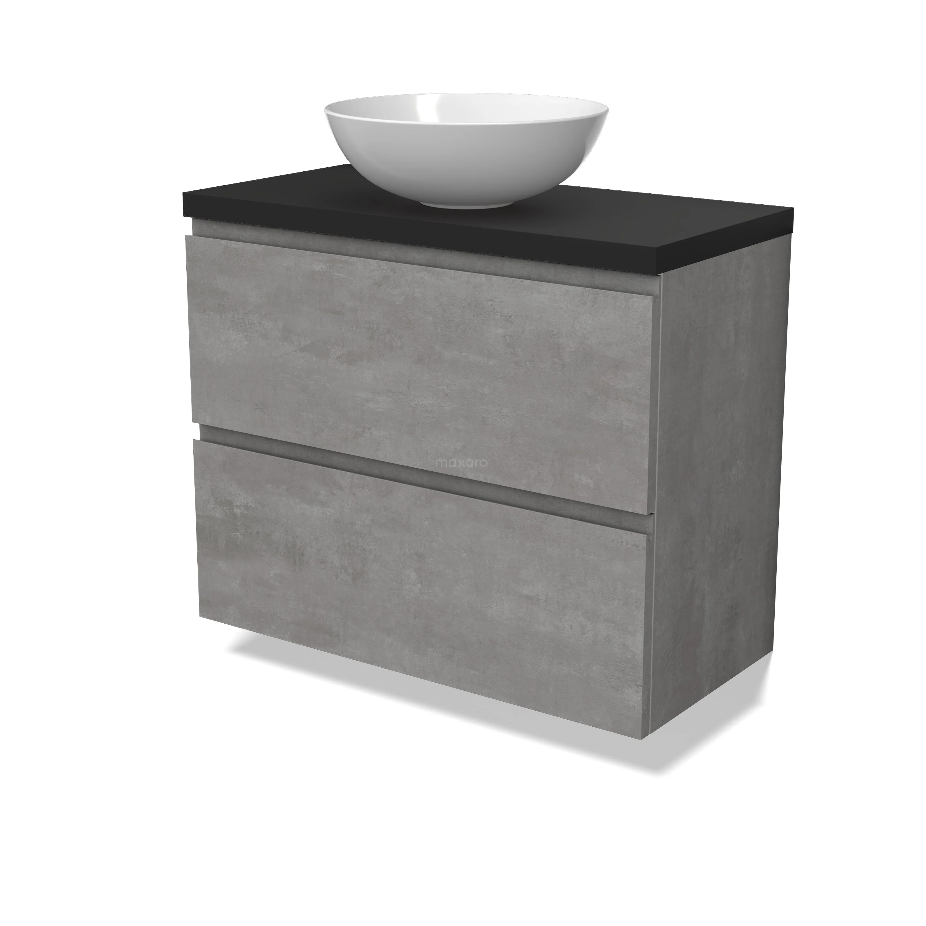 Modulo Plato Slim Badmöbel mit Aufsatzwaschbecken | 80 cm Hellgrauer Beton Grifflos front Matt Schwarz blatt 2 übereinanderliegende Schubladen