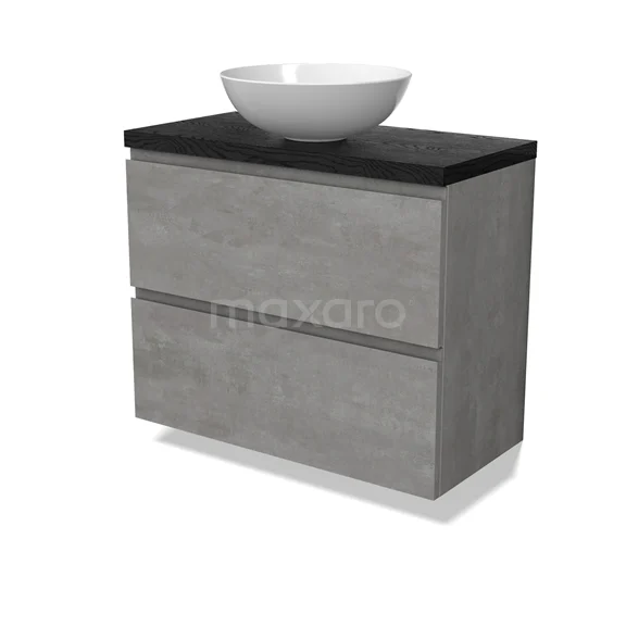 Modulo Plato Slim Badmöbel mit Aufsatzwaschbecken | 80 cm Hellgrauer Beton Grifflos front Schwarze Eiche blatt 2 übereinanderliegende Schubladen