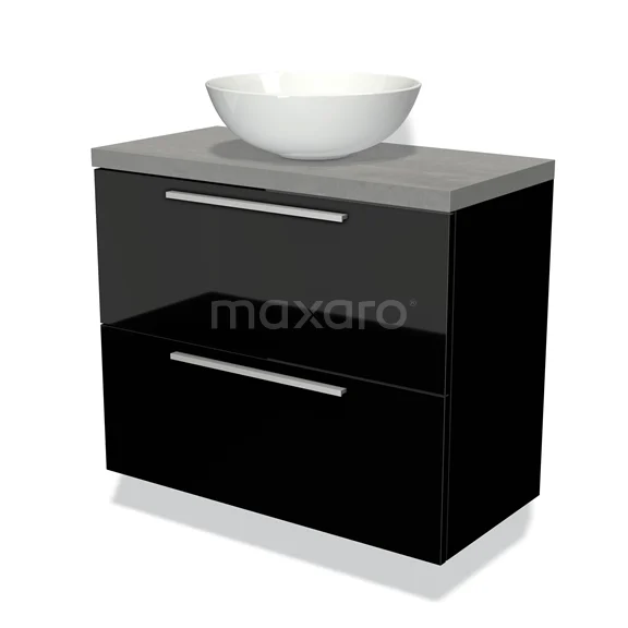 Modulo Plato Slim Badmöbel mit Aufsatzwaschbecken | 80 cm Hochglanz Schwarz Flach front Hellgrauer Beton blatt 2 übereinanderliegende Schubladen