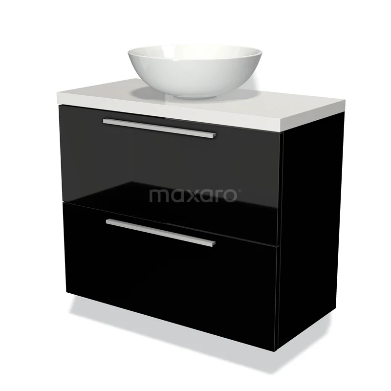 Modulo Plato Slim Badmöbel mit Aufsatzwaschbecken | 80 cm Hochglanz Schwarz Flach front Hochglanz Weiß blatt 2 übereinanderliegende Schubladen