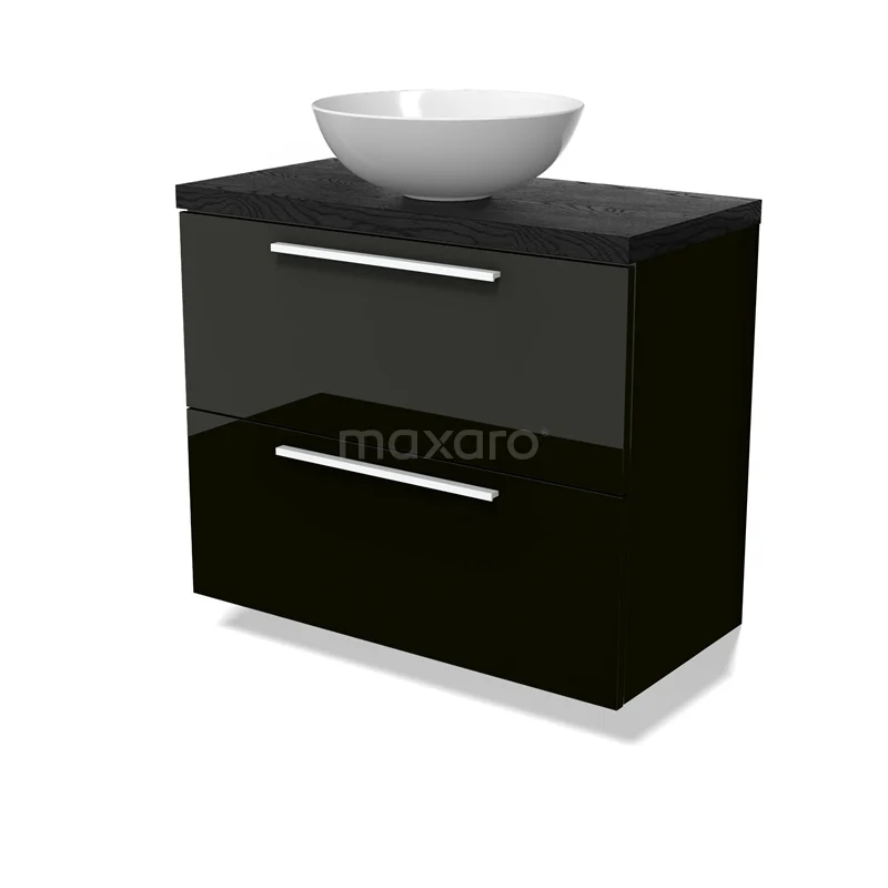 Modulo Plato Slim Badmöbel mit Aufsatzwaschbecken | 80 cm Hochglanz Schwarz Flach front Schwarze Eiche blatt 2 übereinanderliegende Schubladen