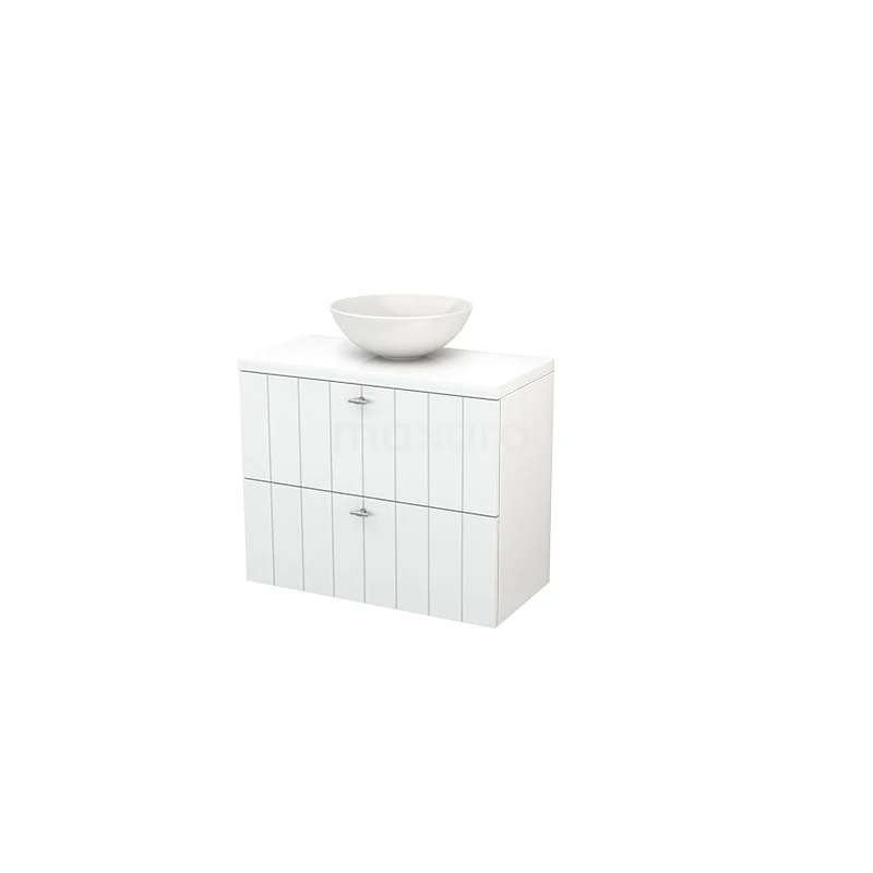 Modulo+ Plato Slim Badmöbel mit Aufsatzwaschbecken | 80 cm Hochglanz Weiß Lamelle front Hochglanz Weiß blatt 2 übereinanderliegende Schubladen