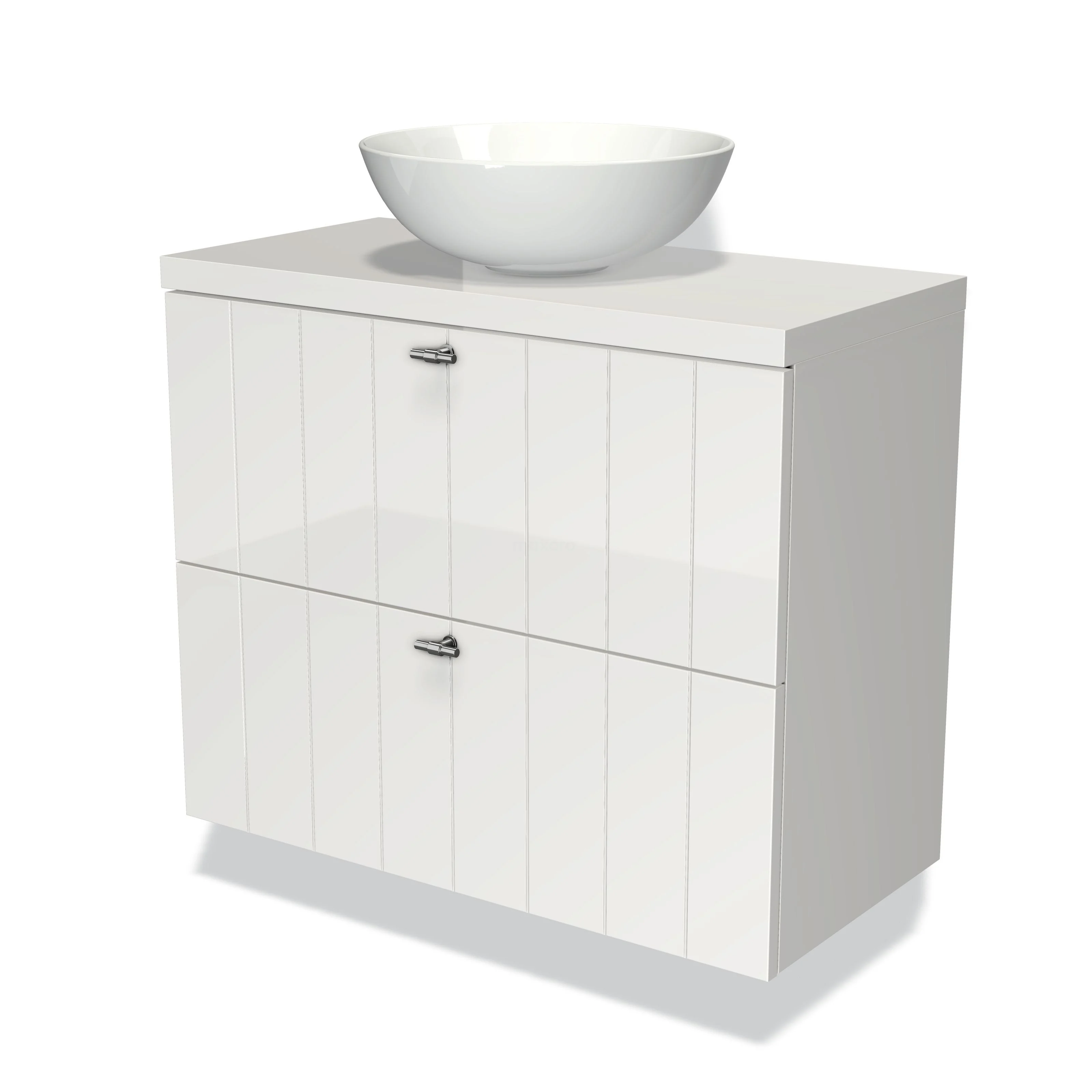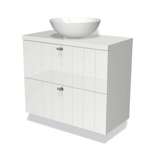 Modulo Plato Slim Badmöbel mit Aufsatzwaschbecken | 80 cm Hochglanz Weiß Lamelle front Hochglanz Weiß blatt 2 übereinanderliegende Schubladen