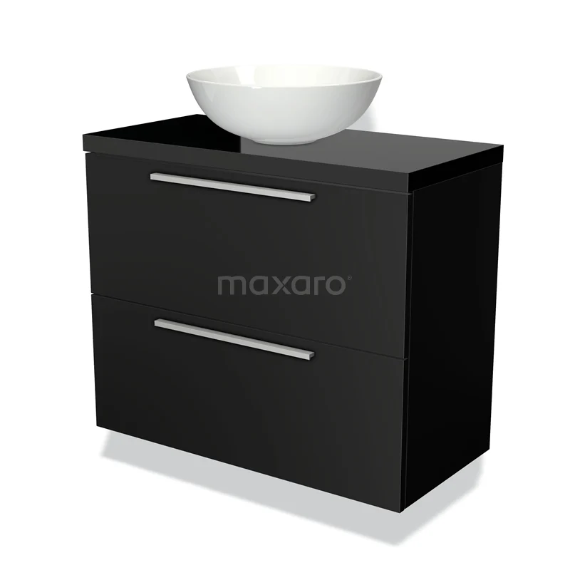 Modulo Plato Slim Badmöbel mit Aufsatzwaschbecken | 80 cm Matt Schwarz Flach front Hochglanz Schwarz blatt 2 übereinanderliegende Schubladen