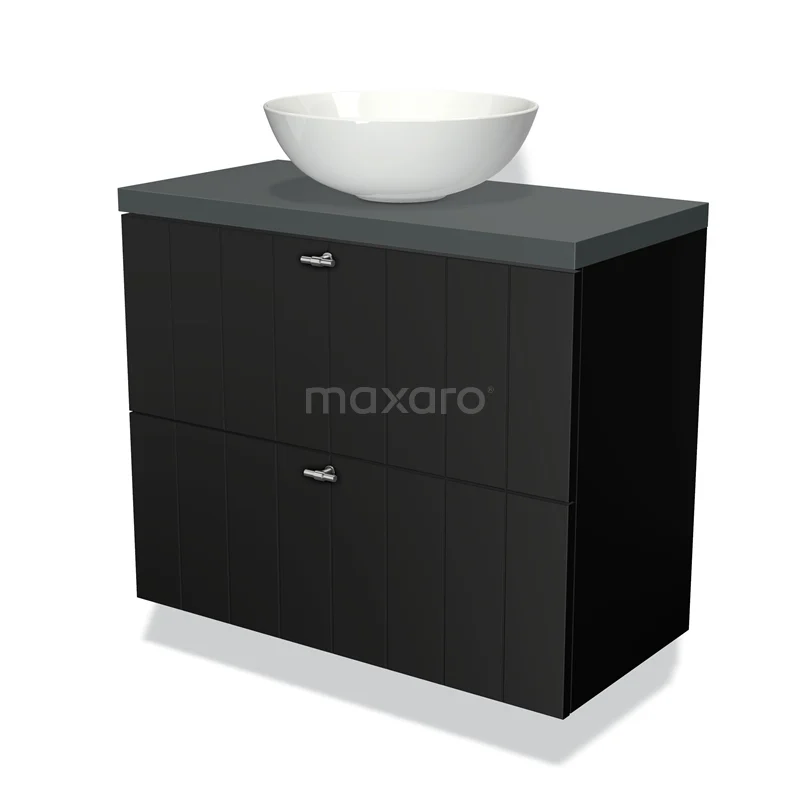 Modulo Plato Slim Badmöbel mit Aufsatzwaschbecken | 80 cm Matt Schwarz Lamelle front Dunkelgrau blatt 2 übereinanderliegende Schubladen