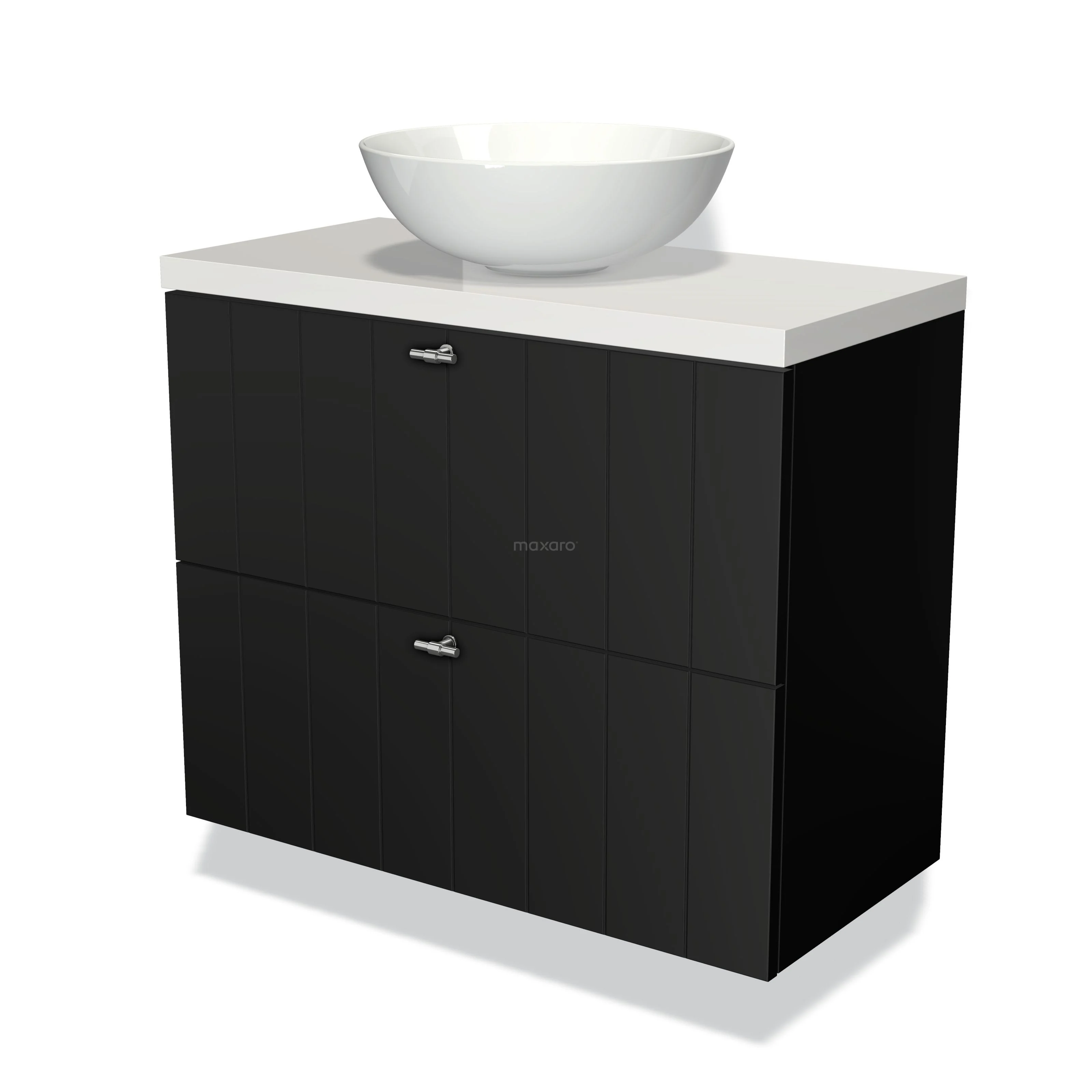 Modulo Plato Slim Badmöbel mit Aufsatzwaschbecken | 80 cm Matt Schwarz Lamelle front Hochglanz Weiß blatt 2 übereinanderliegende Schubladen