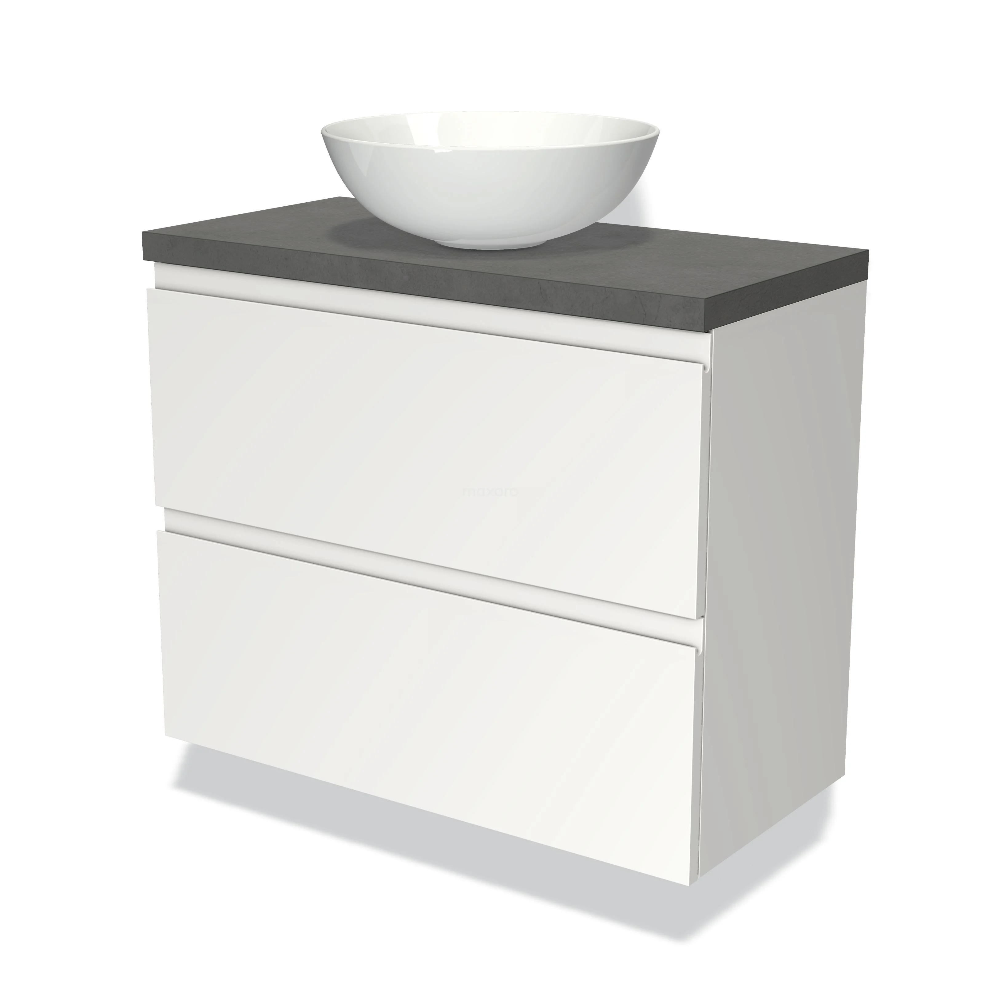 Modulo Plato Slim Badmöbel mit Aufsatzwaschbecken | 80 cm Matt Weiß Grifflos front Dunkelgrauer Beton blatt 2 übereinanderliegende Schubladen