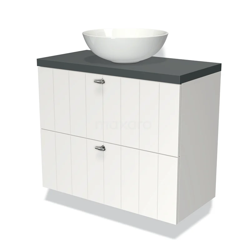 Modulo Plato Slim Badmöbel mit Aufsatzwaschbecken | 80 cm Matt Weiß Lamelle front Dunkelgrau blatt 2 übereinanderliegende Schubladen