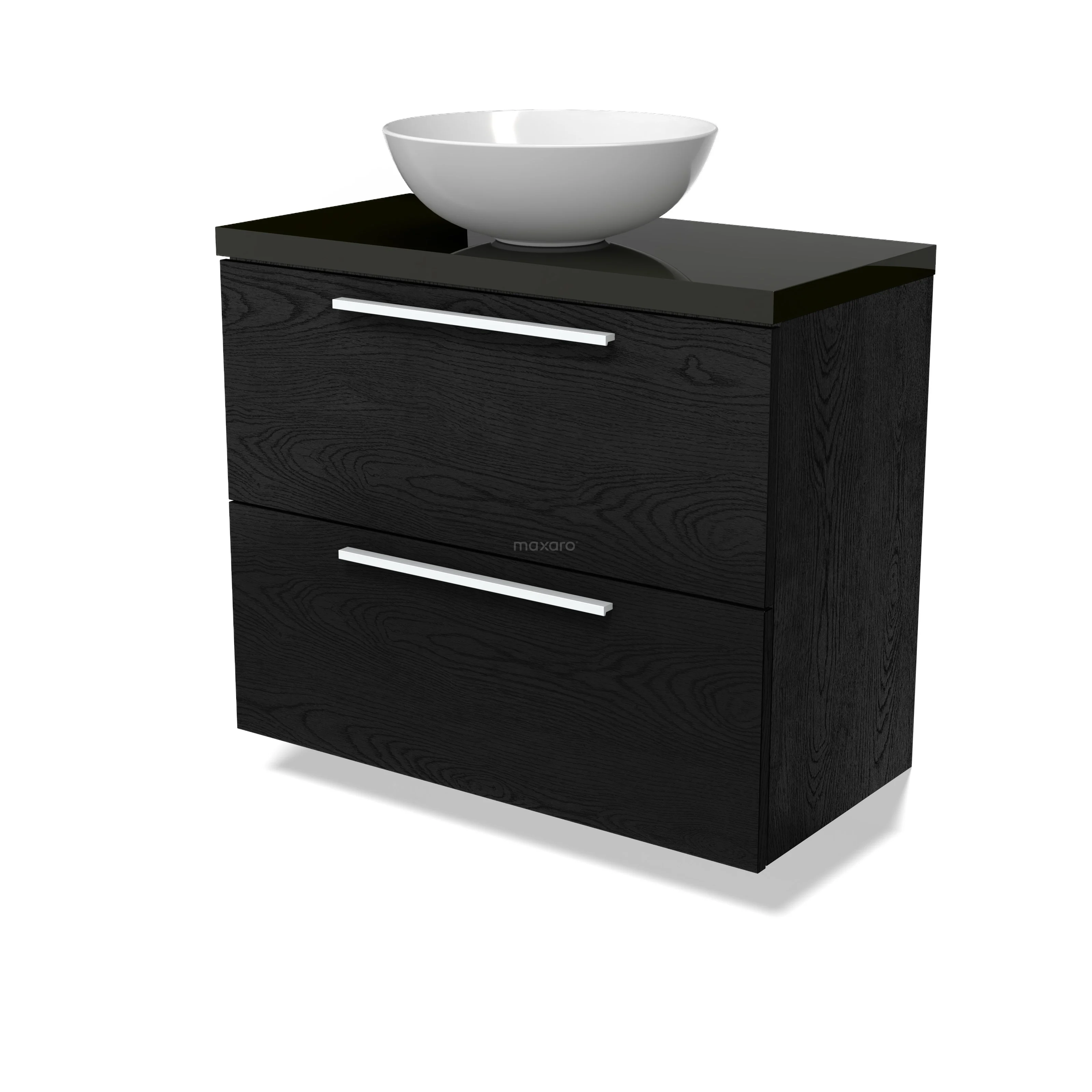 Modulo Plato Slim Badmöbel mit Aufsatzwaschbecken | 80 cm Schwarze Eiche Flach front Hochglanz Schwarz blatt 2 übereinanderliegende Schubladen