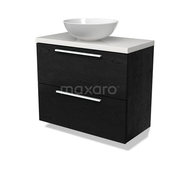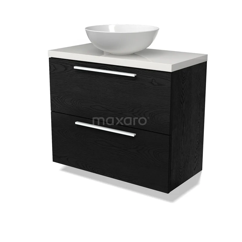 Modulo Plato Slim Badmöbel mit Aufsatzwaschbecken | 80 cm Schwarze Eiche Flach front Hochglanz Weiß blatt 2 übereinanderliegende Schubladen