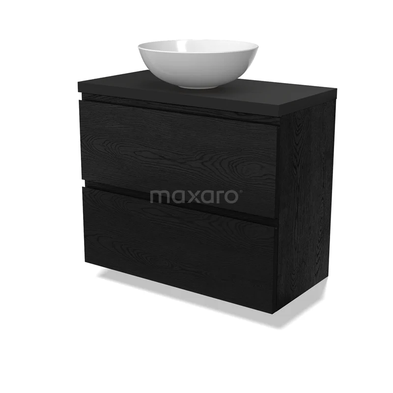 Modulo Plato Slim Badmöbel mit Aufsatzwaschbecken | 80 cm Schwarze Eiche Grifflos front Matt Schwarz blatt 2 übereinanderliegende Schubladen