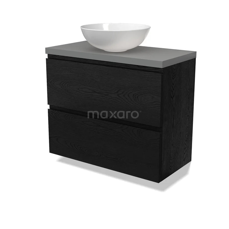 Modulo Plato Slim Badmöbel mit Aufsatzwaschbecken | 80 cm Schwarze Eiche Grifflos front Mittelgrau blatt 2 übereinanderliegende Schubladen