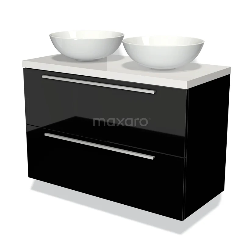 Waschtischunterschrank mit Konsole 100cm Modulo Plato Hochglanz Schwarz 2 Schubladen Flach Hochglanz Weiß Platte