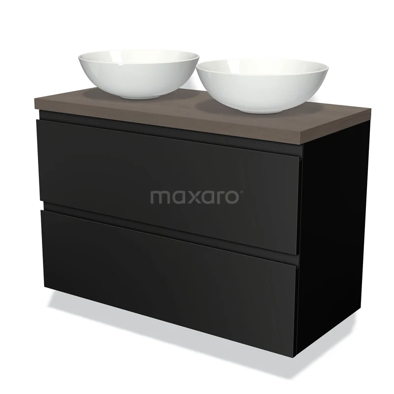 Waschtischunterschrank mit Konsole 100cm Modulo Plato Matt Schwarz 2 Schubladen Grifflos dunkelbraune Eiche Platte