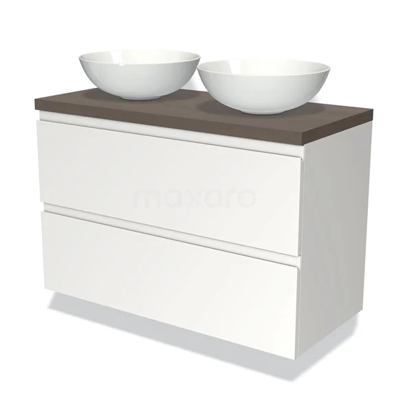 Waschtischunterschrank mit Konsole 100cm Modulo Plato Matt Weiß 2 Schubladen Grifflose dunkelbraune Eiche Platte