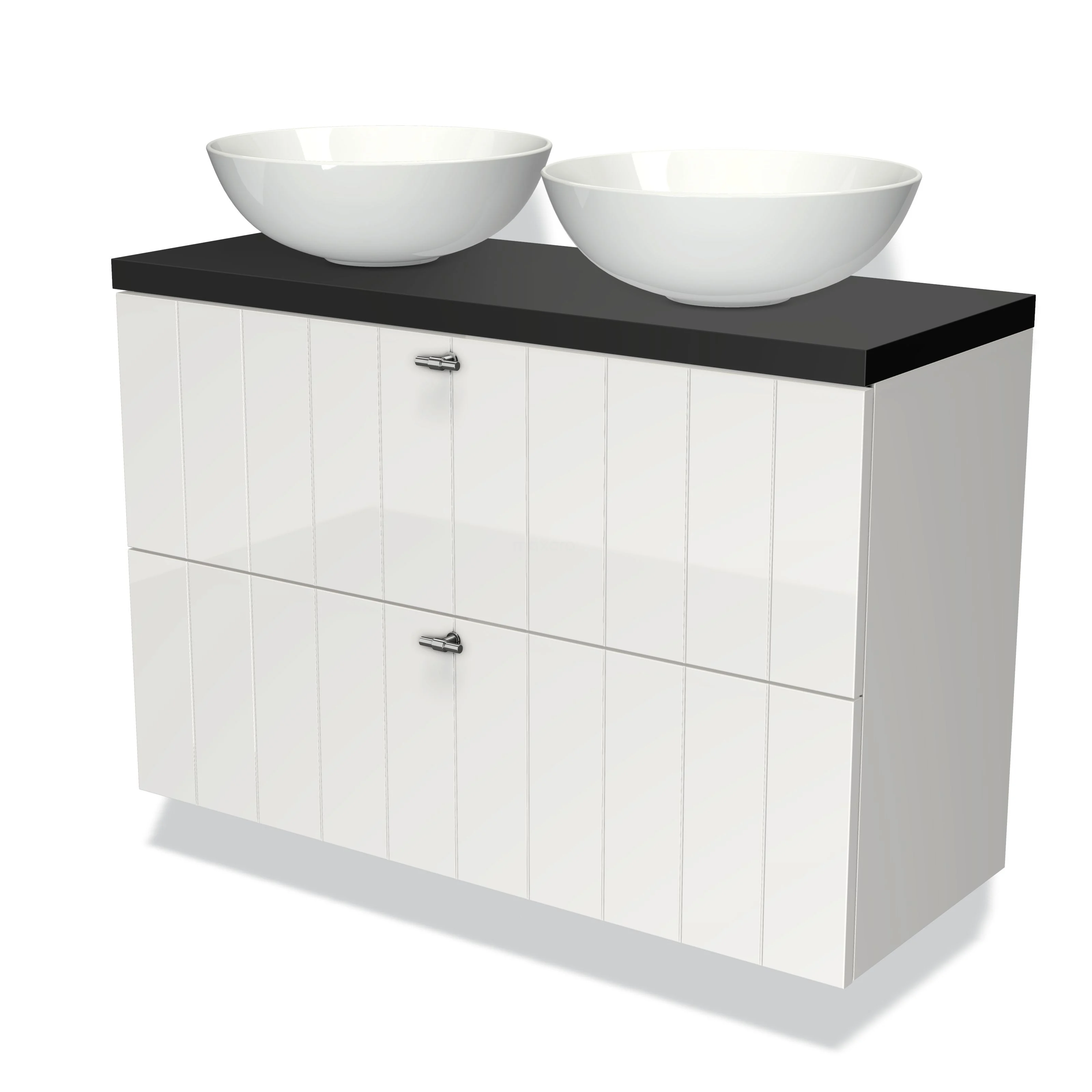 Modulo Plato Slim Badmöbel mit Aufsatzwaschbecken | 100 cm Hochglanz Weiß Lamelle front Matt Schwarz blatt 2 übereinanderliegende Schubladen