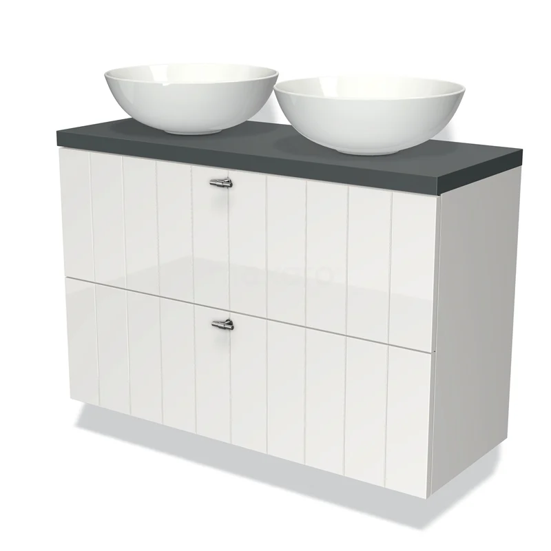 Weißes Badezimmermöbel mit schwarzer Platte und zwei runden Aufsatzwaschbecken, modernes Design mit geräumigen Schubladen.