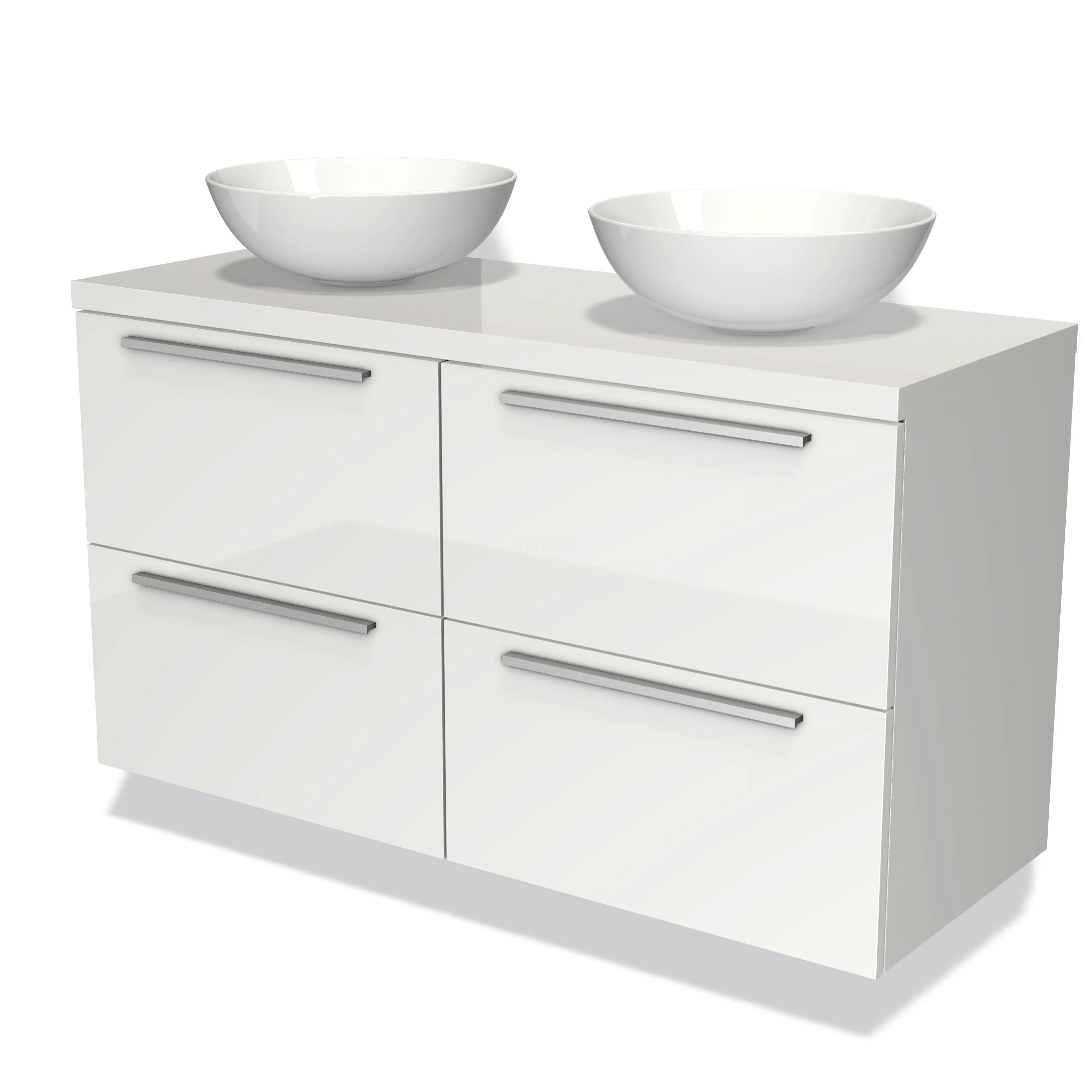 Weißes Badezimmermöbel mit vier Schubladen und zwei runden Waschbecken, glänzend verarbeitet, ideal für moderne Badezimmergestaltung.