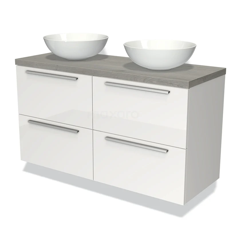 Waschtischunterschrank mit Konsole 120cm Modulo Plato Hochglanz Weiß 4 Schubladen Flach Graue Eiche Platte