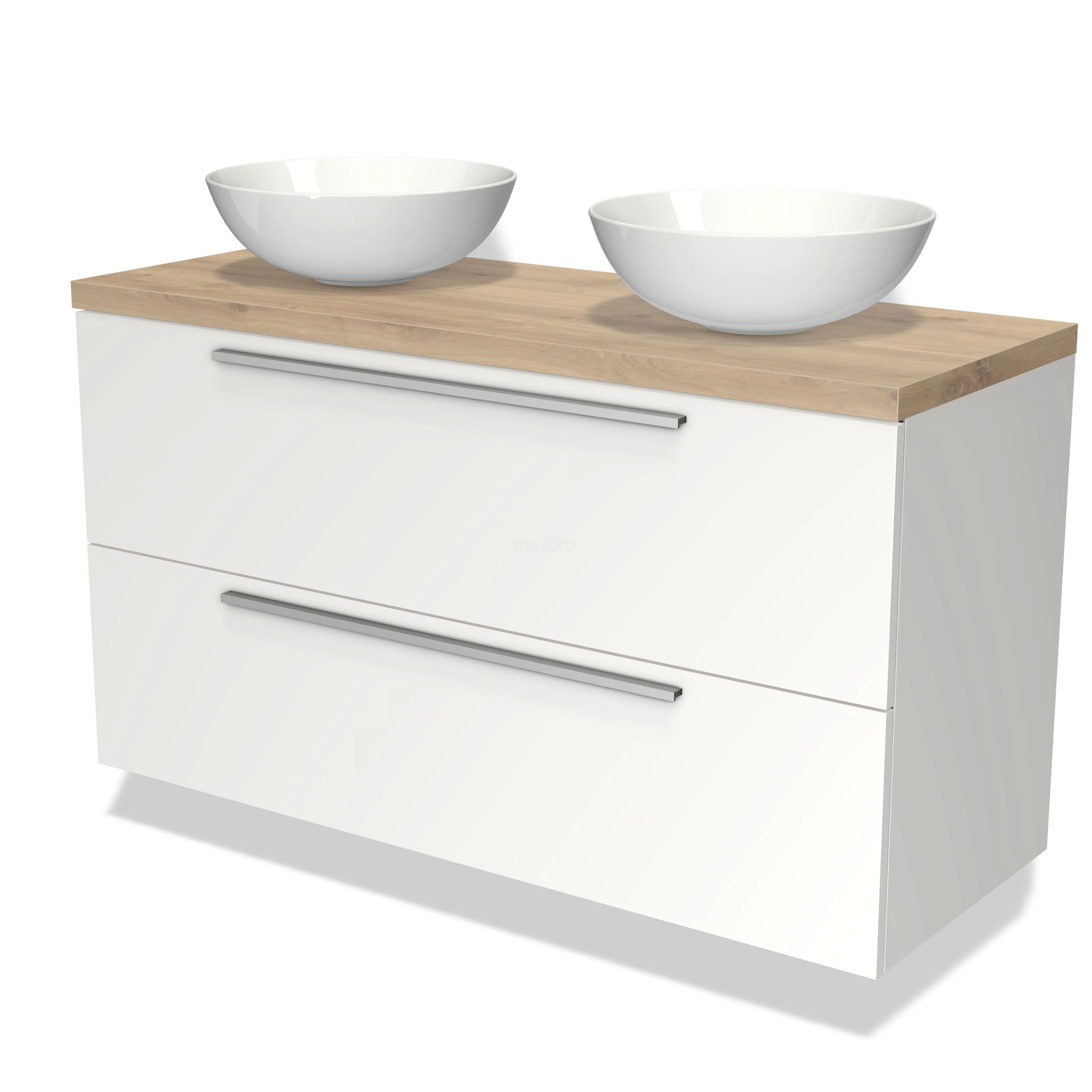 Waschtischunterschrank mit Konsole 120cm Modulo Plato Matt Weiß 2 Schubladen Flach Hellbraune Eiche Platte