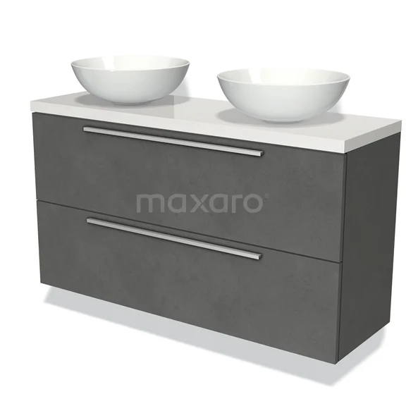 Modulo Plato Slim Badmöbel mit Aufsatzwaschbecken | 120 cm Dunkelgrauer Beton Flach front Hochglanz Weiß blatt 2 übereinanderliegende Schubladen