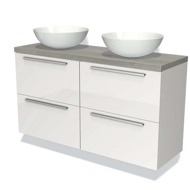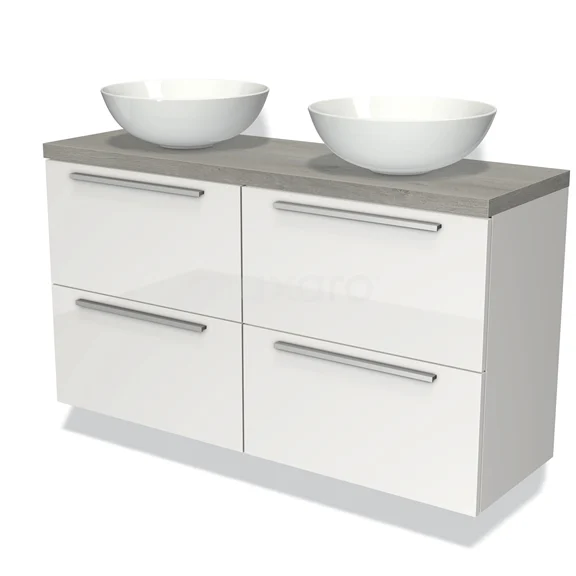 Waschtischunterschrank mit Konsole 120cm Modulo Plato Slim Hochglanz Weiß 4 Schubladen Flach Graue Eiche Platte