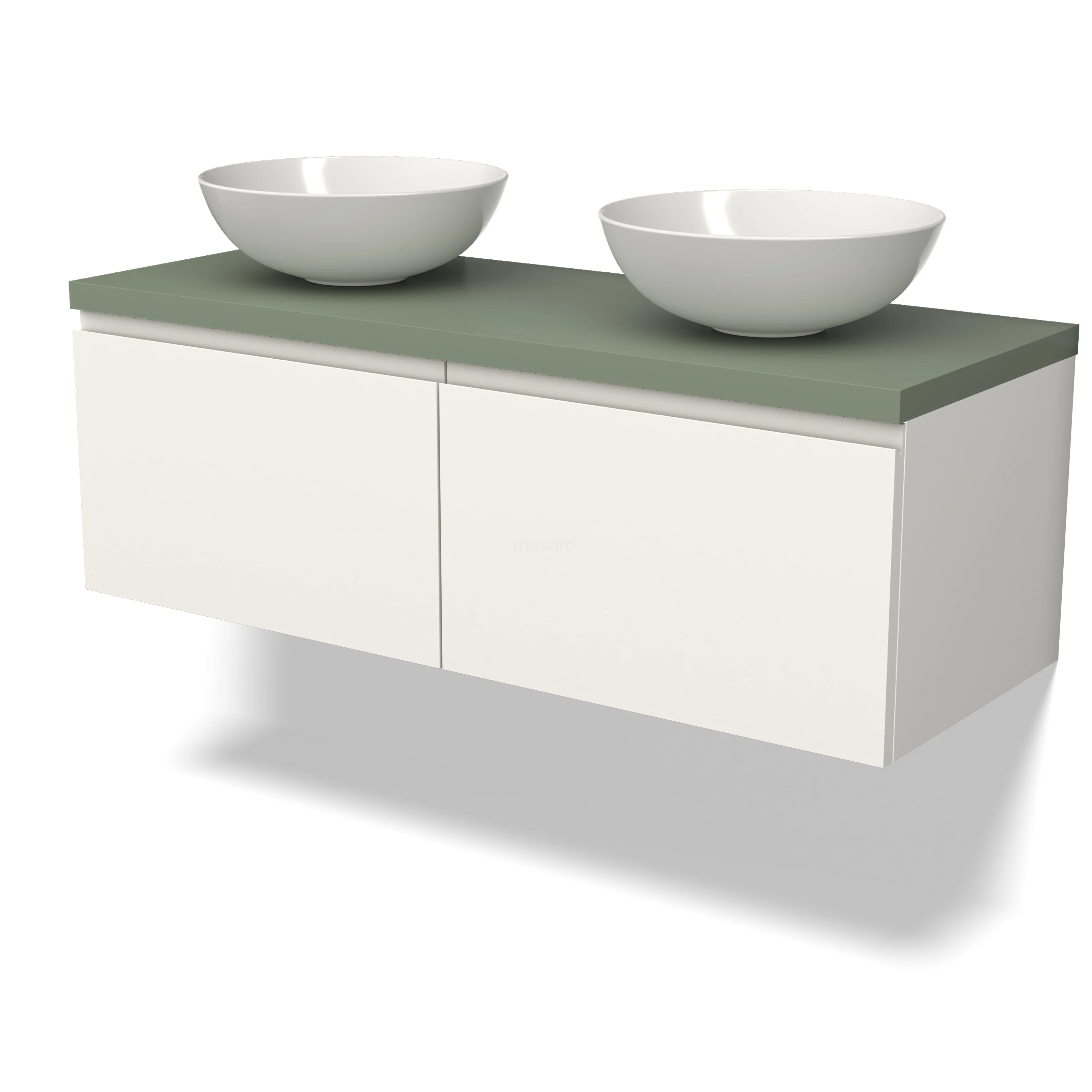 Modulo Plato Badmöbel mit Aufsatzwaschbecken | 120 cm Matt Weiß Grifflos front Salbeigrün blatt 2 nebeneinanderliegende Schubladen