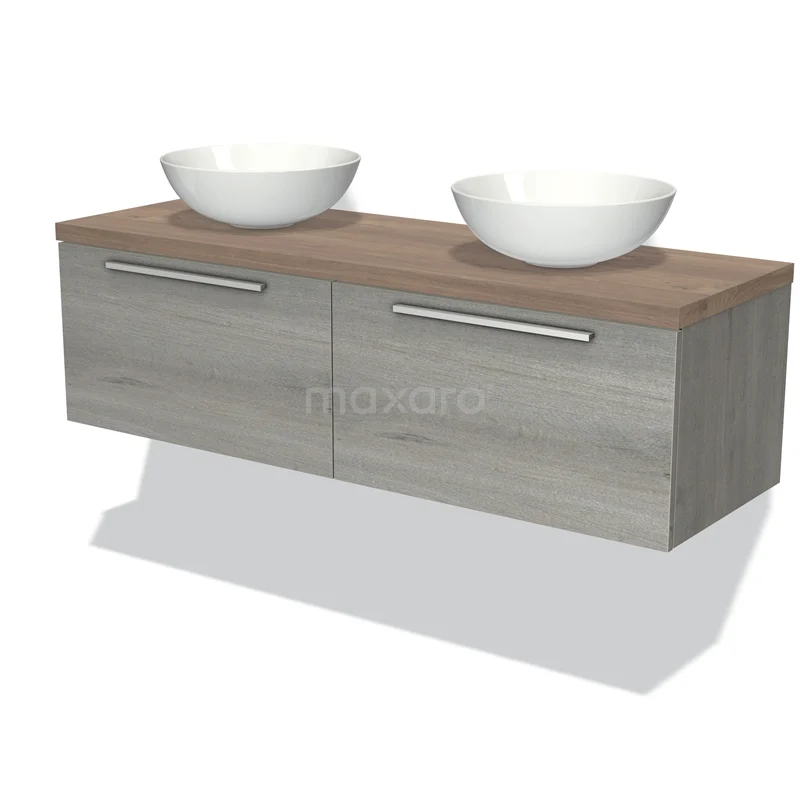 Waschtischunterschrank mit Konsole 140cm Modulo Plato Grau Eiche 2 Schubladen Flach Mittelbraune Eiche Platte