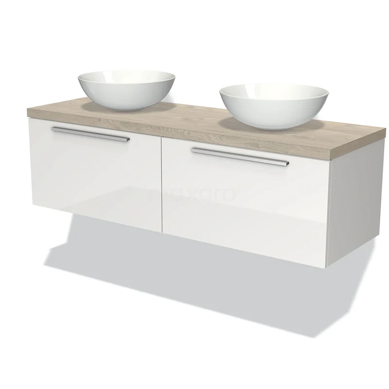 Waschtischunterschrank mit Konsole 140cm Modulo Plato Hochglanz Weiß 2 Schubladen Flach Hellgraue Eiche Platte
