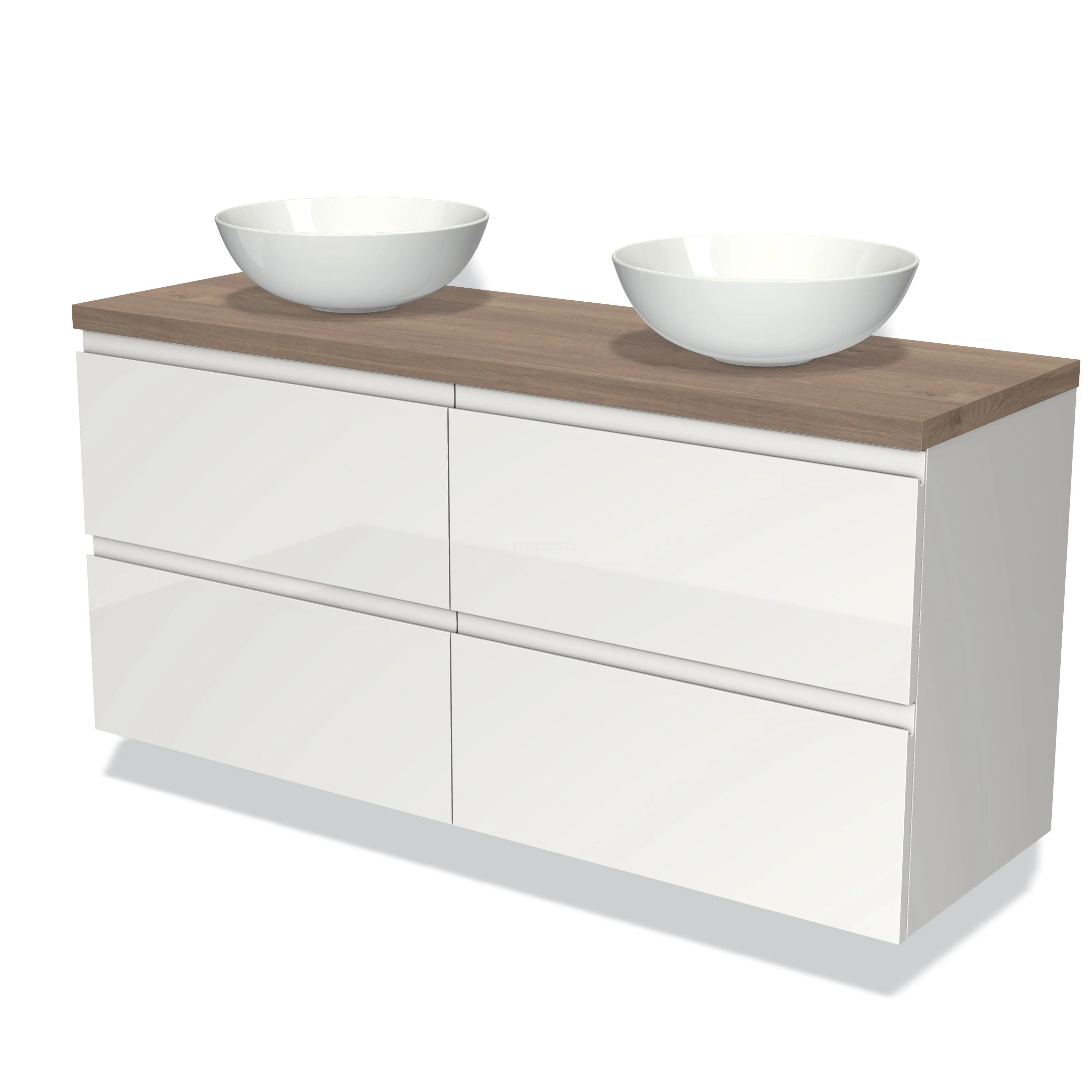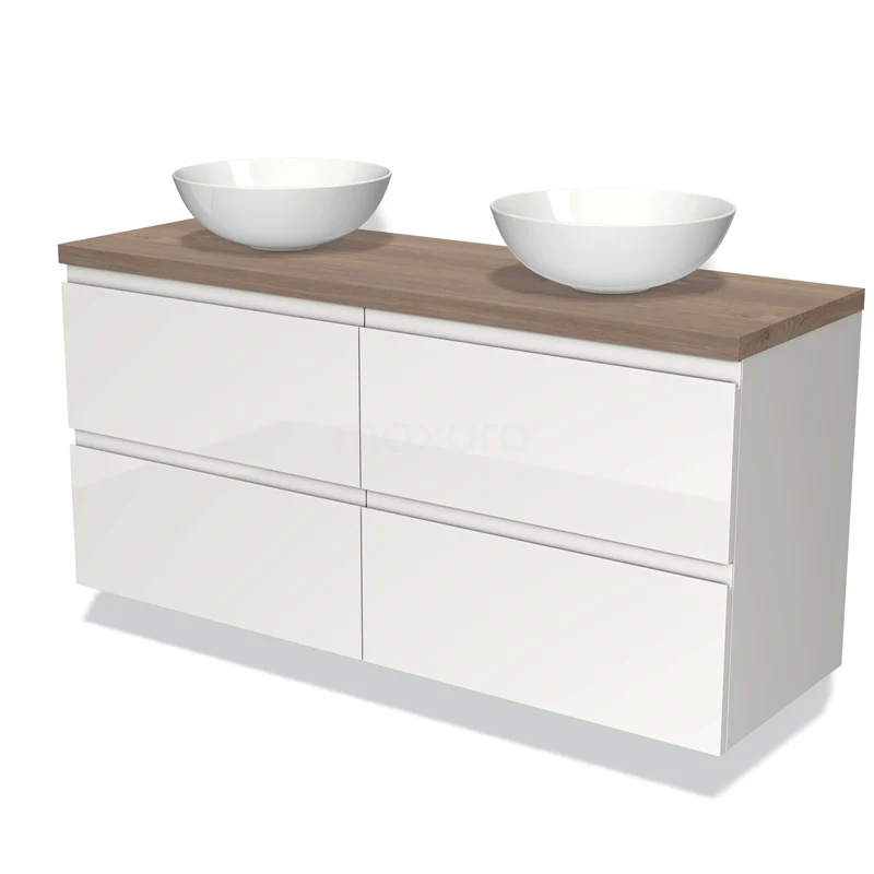 Waschtischunterschrank mit Konsole 140cm Modulo Plato Hochglanz Weiß 4 Schubladen Grifflos mittelbraune Eiche Platte