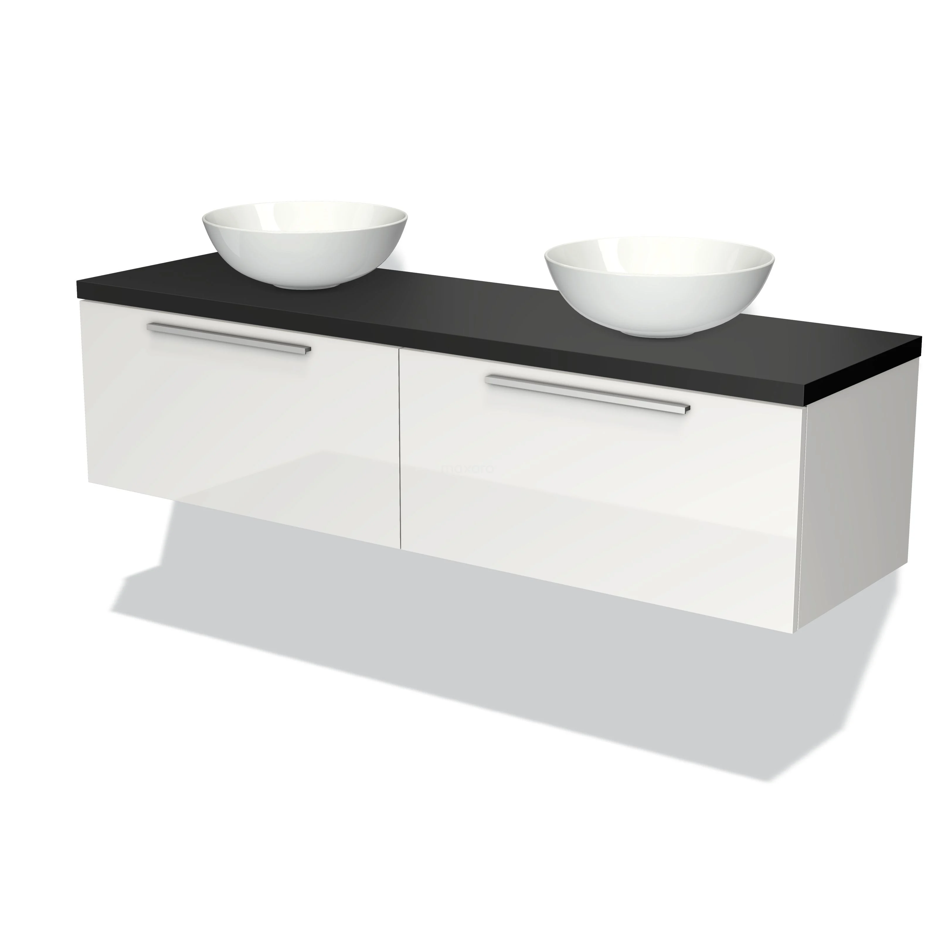 Weißes Hochglanz-Badmöbel mit zwei Aufsatzwaschbecken, schwarzer Arbeitsplatte und modernen Haltegriffen, ideal für ein stilvolles Badezimmer.